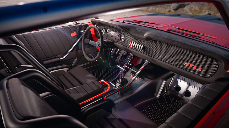 Moving away from STL1 we are welcomed by a raised ride height, provided by a completely revised undercarriage, comprehensive of independent suspension with coilovers, inboard brakes, a brand new differential and a hefty new driveshaft to stay ahead of those American horses. The aggressive all terrain tires wrap around a set of iconic Turbine wheels. The Mustang lines are mainly left untouched, we can notice a few details focused on enhancing the off-road looks and capabilities of STL1, such as a reworked front bumper, complete with a set of rally style fog lamps, hood straps, a bulky sump guard and a slimmer rear end, just to get those few extra inches of ground clearance.